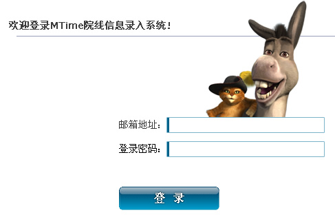 依次输入你在Mtime网站上注册时使用的邮箱地址和登录密码,点“登录”按钮 登录成功后你将看到欢迎界面欢迎界面里会把你负责的影院一一列出