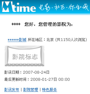 点击影院名称或“更新影讯”,就可以进入到相应影院的影讯管理界面了。 影讯管理这是影讯系统的工作界面,上方的左侧为影院的logo,点击后直接进入影院页面;右侧上方为影讯日历,显示最近十天影讯的更新情况;下方为导航栏,点击“影讯发布”、“影院管理”等按钮可以切换到不同功能。 导航栏右侧有两个黄色按钮,点击“使用帮助”按钮,就可以看到对相应功能的使用说明,看过“使用帮助”后,点击帮助区(黄色边缘)右上角的小叉就可以关闭了。点击“返回主界面”按钮,就可以回到你管理的影院的列表页。 导航栏下方有“发布分厅影讯”和“发布不分厅影讯”两个按钮,如果你采集到的影讯是分厅的,即每个场次都有相对应的“1号厅、2号厅……”,点击“发布分厅影讯”进行录入;如果你采集到的影讯不分厅,点击“发布不分厅影讯”进行录入。