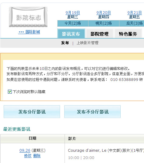 界面下方列出了最近更新的影讯(如果该影院之前没有录入过影讯,这里可能会没有显示),如果你要对之前录入的影讯进行修改,可以点击相应日期下方的“修改”进行编辑操作。 注意:系统内的所有日期,除了特别注明的,如录入日期等,都是指影讯本身的日期。 |